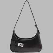 艶のあるフェイクレザーとメタルバックルが上品に映えるミニショルダーバッグ。