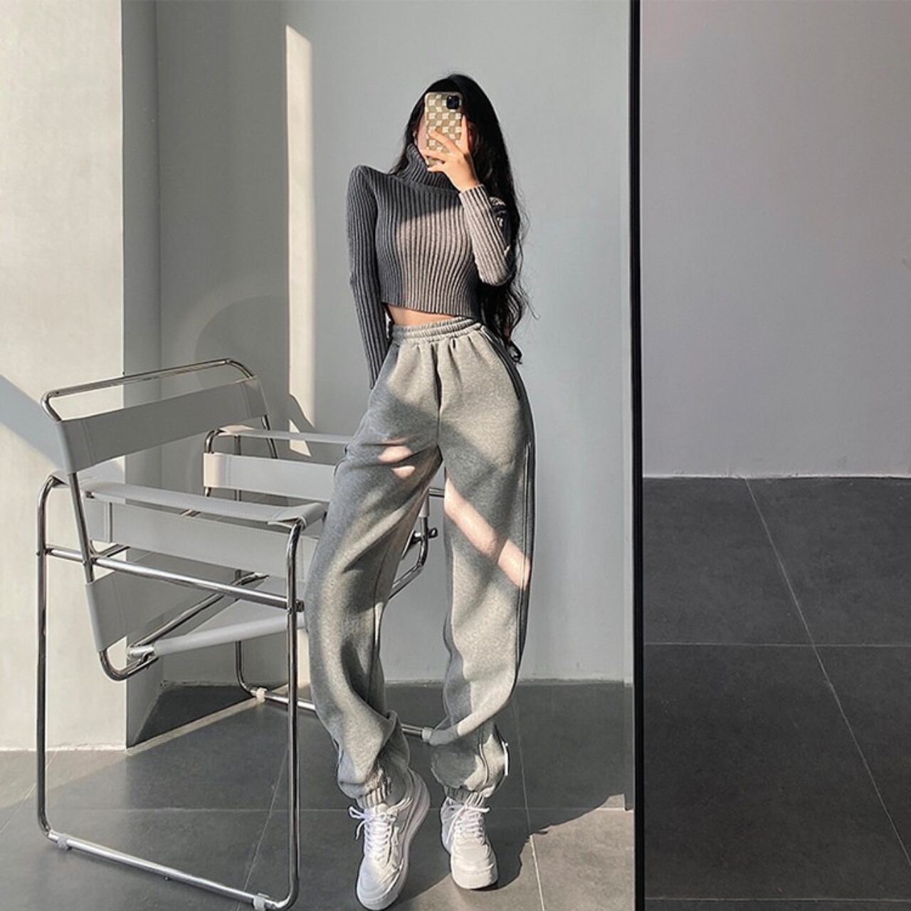リブ編みが縦のラインを強調し、すっきりとした印象を与えるニット。