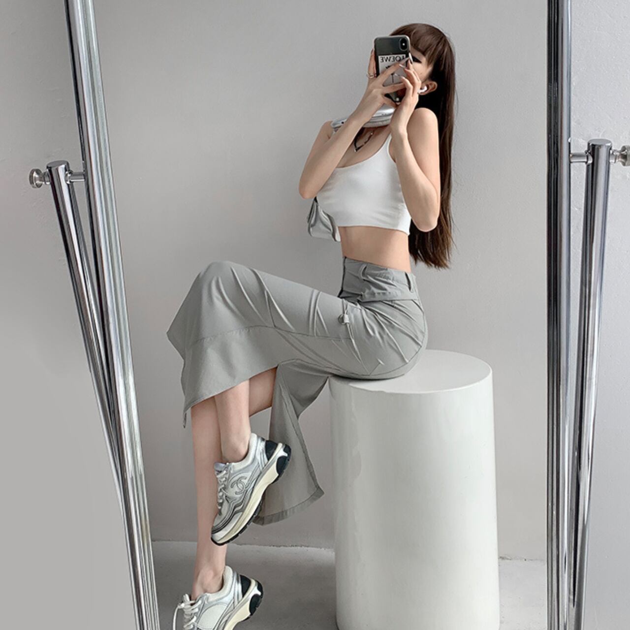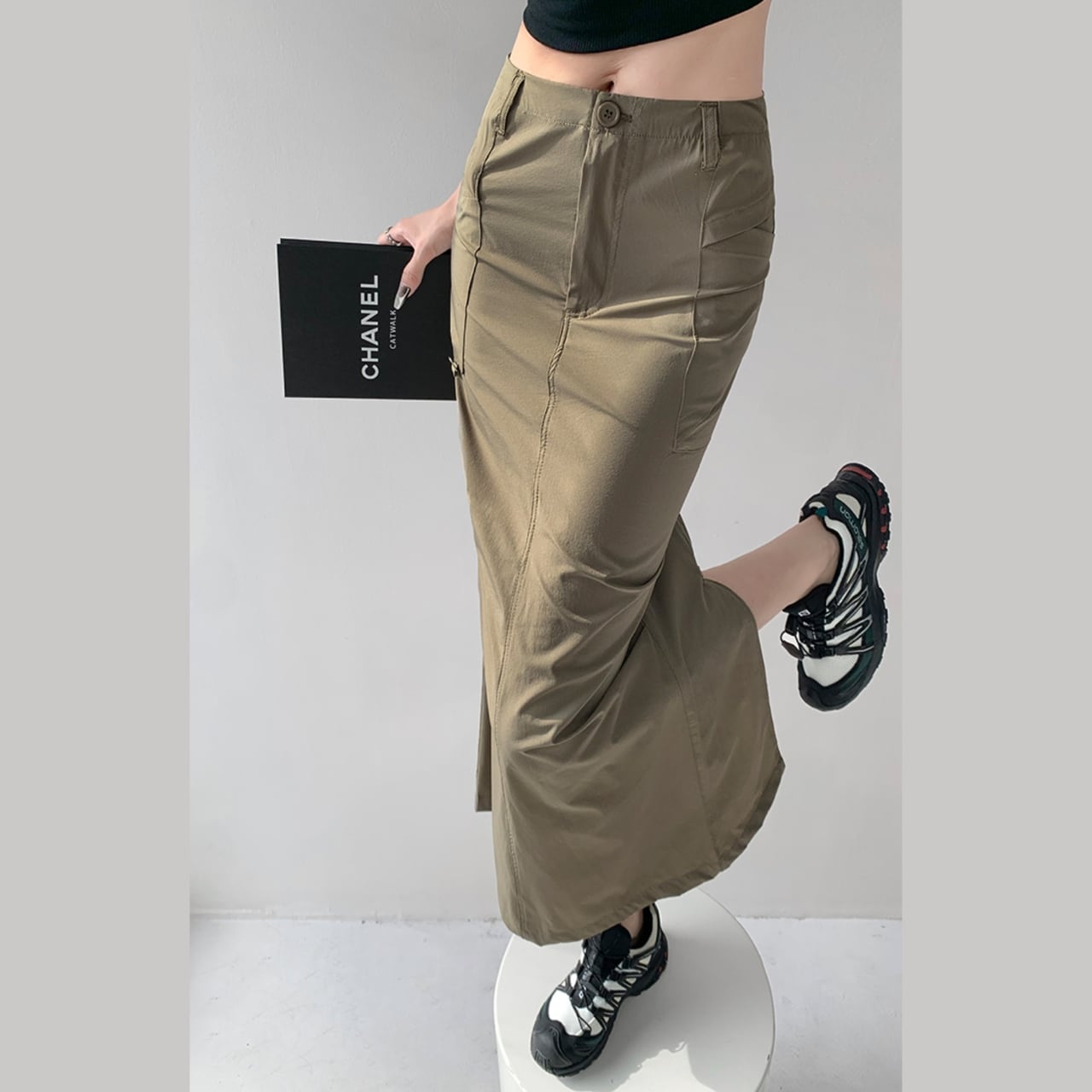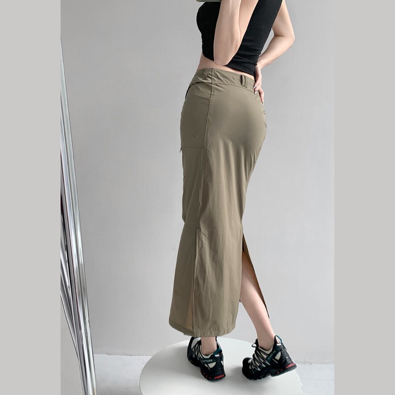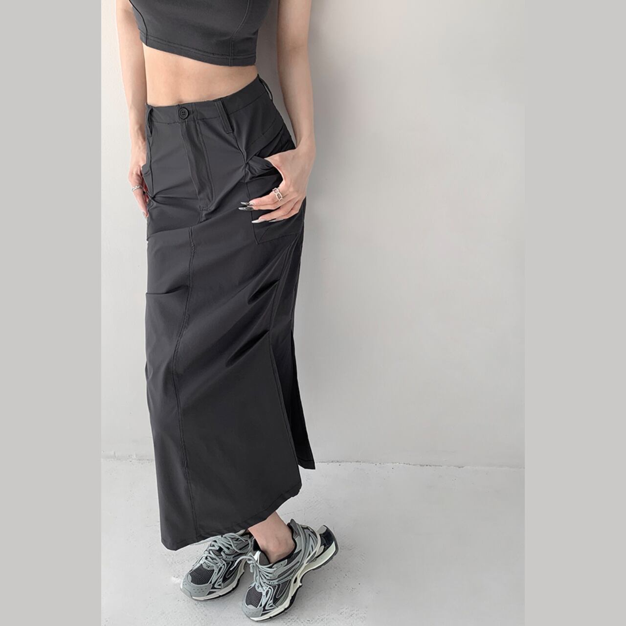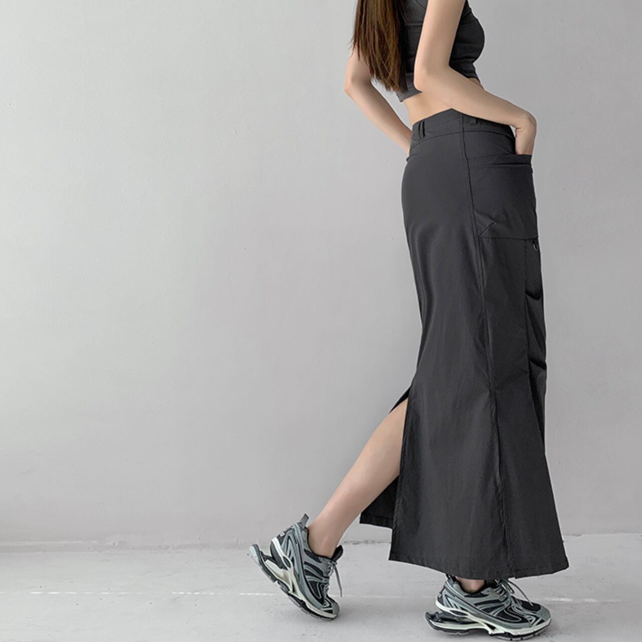 スリット入りのペンシルスカート。縦のラインを強調し、スタイルアップ効果が期待できます。カジュアルなトップスとスニーカーを合わせて普段使いに、ブラウスやヒールと合わせてオフィスにも着ていける、着回し力の高い一枚です。