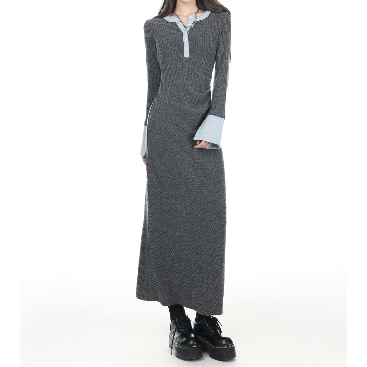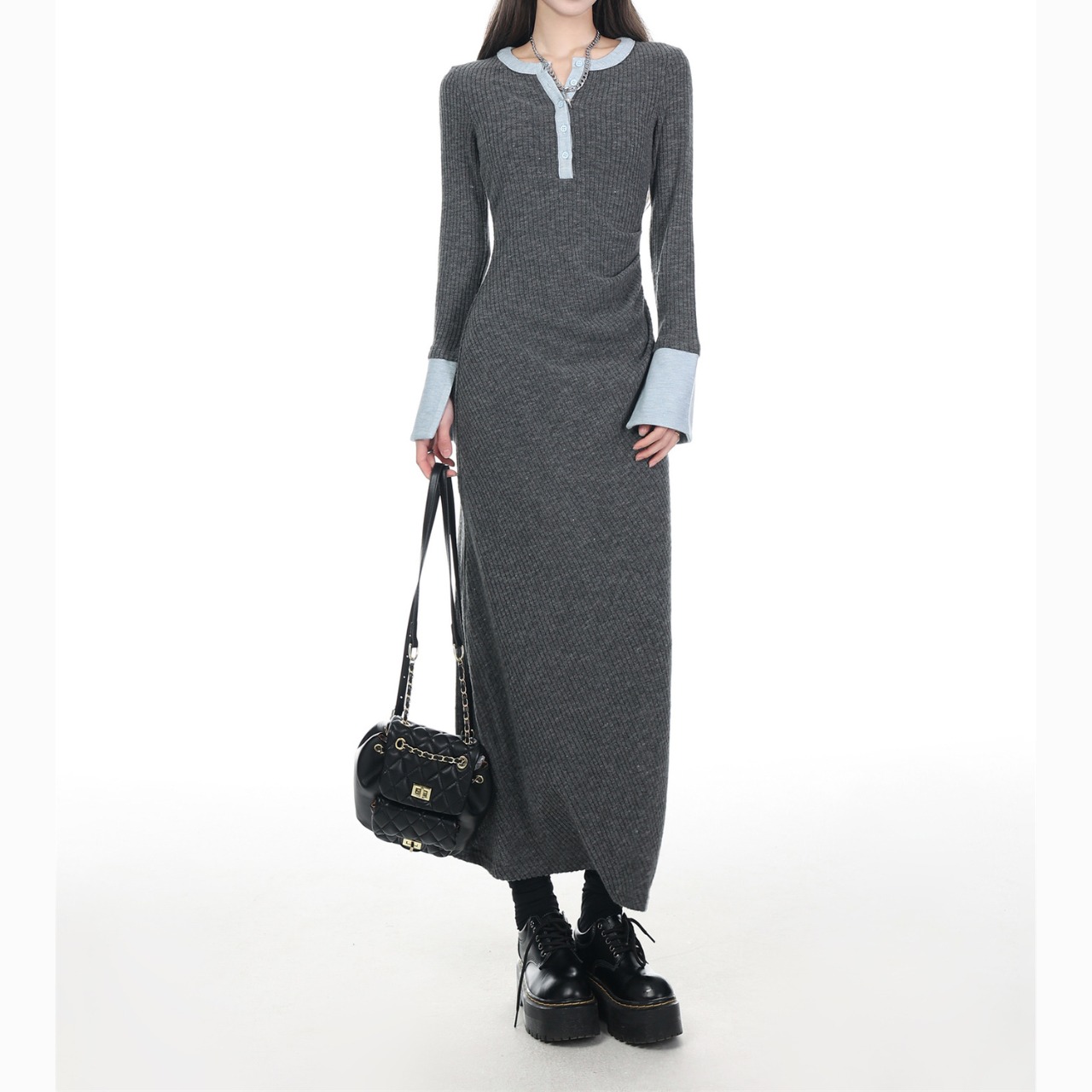 A00035 コントラストヘンリーネック・リブマキシワンピース