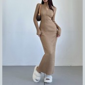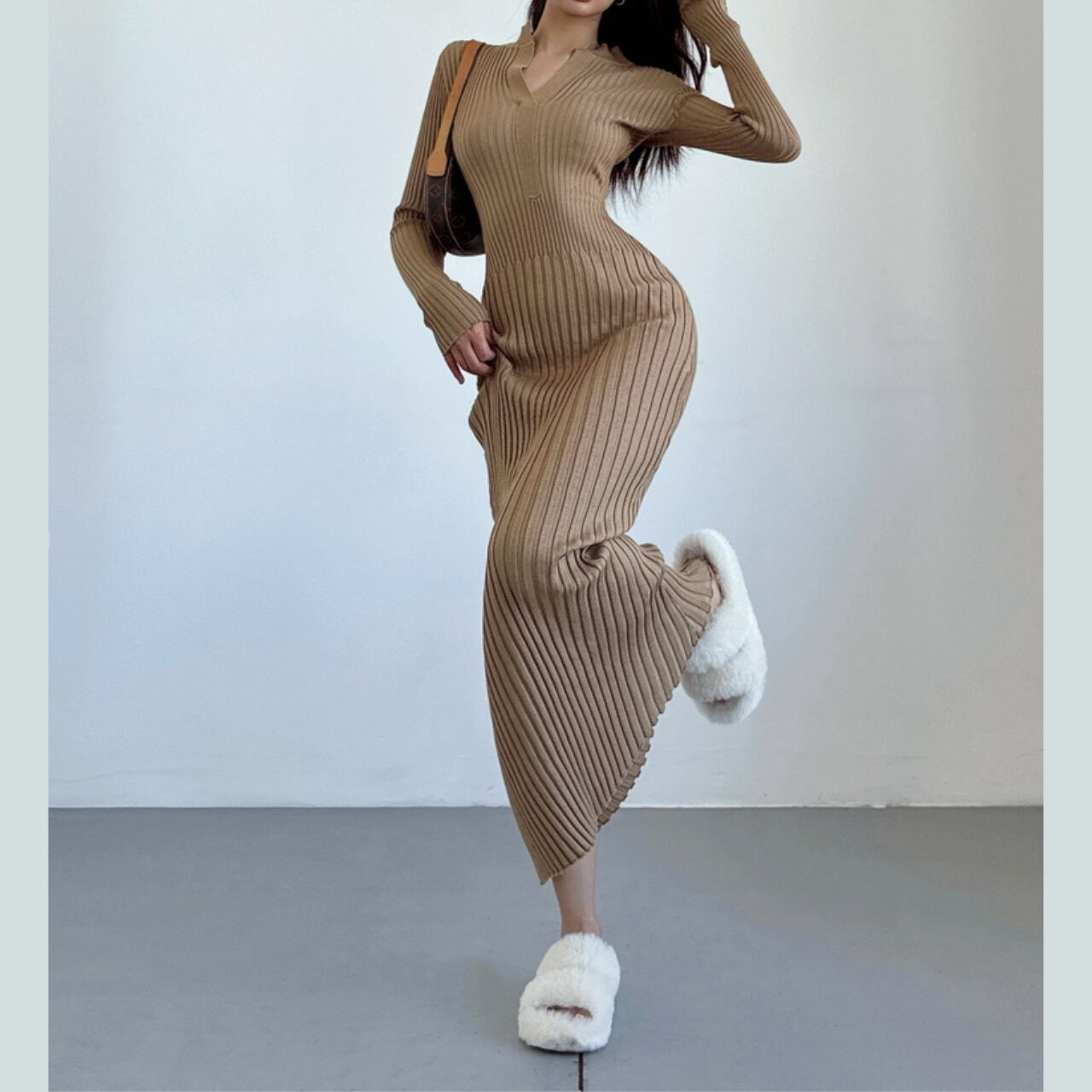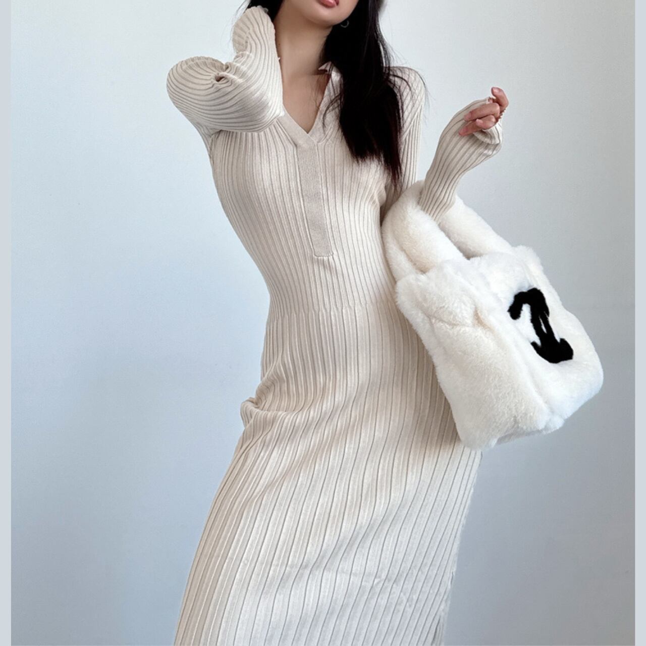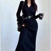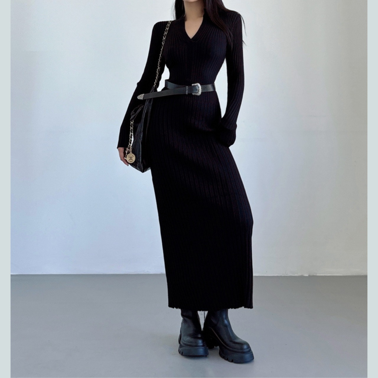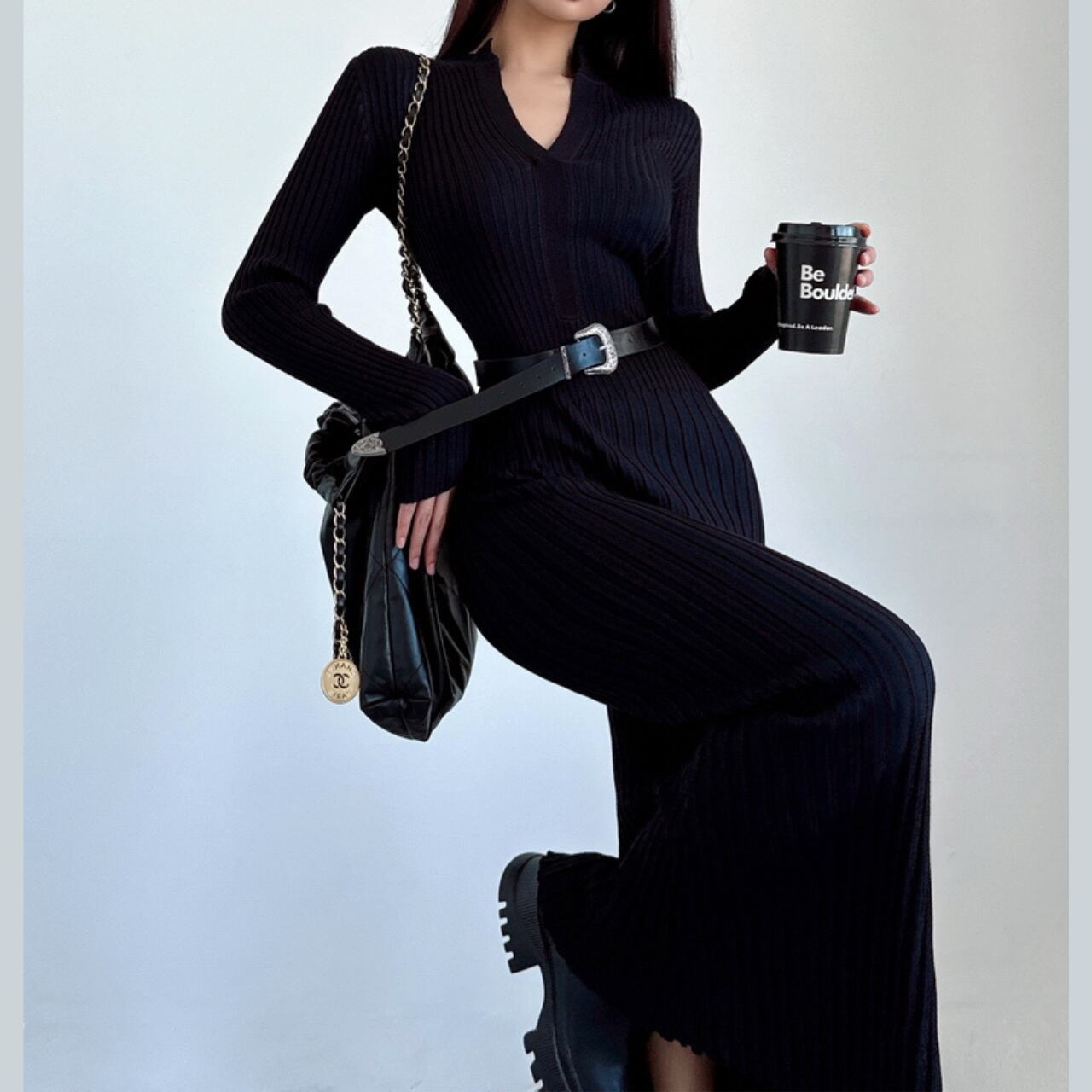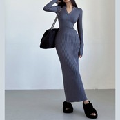 縦ラインを強調するリブ編みが、ボディラインを美しく見せてくれるロングニットワンピース。深めのVネックがデコルテを綺麗に演出し、女性らしさを際立たせます。一枚で着ることはもちろん、ジャケットやシャツを羽織って、オフィススタイルにも対応可能。休日はもちろん、ちょっとしたお出かけにも活躍する、着回し力抜群のアイテムです。