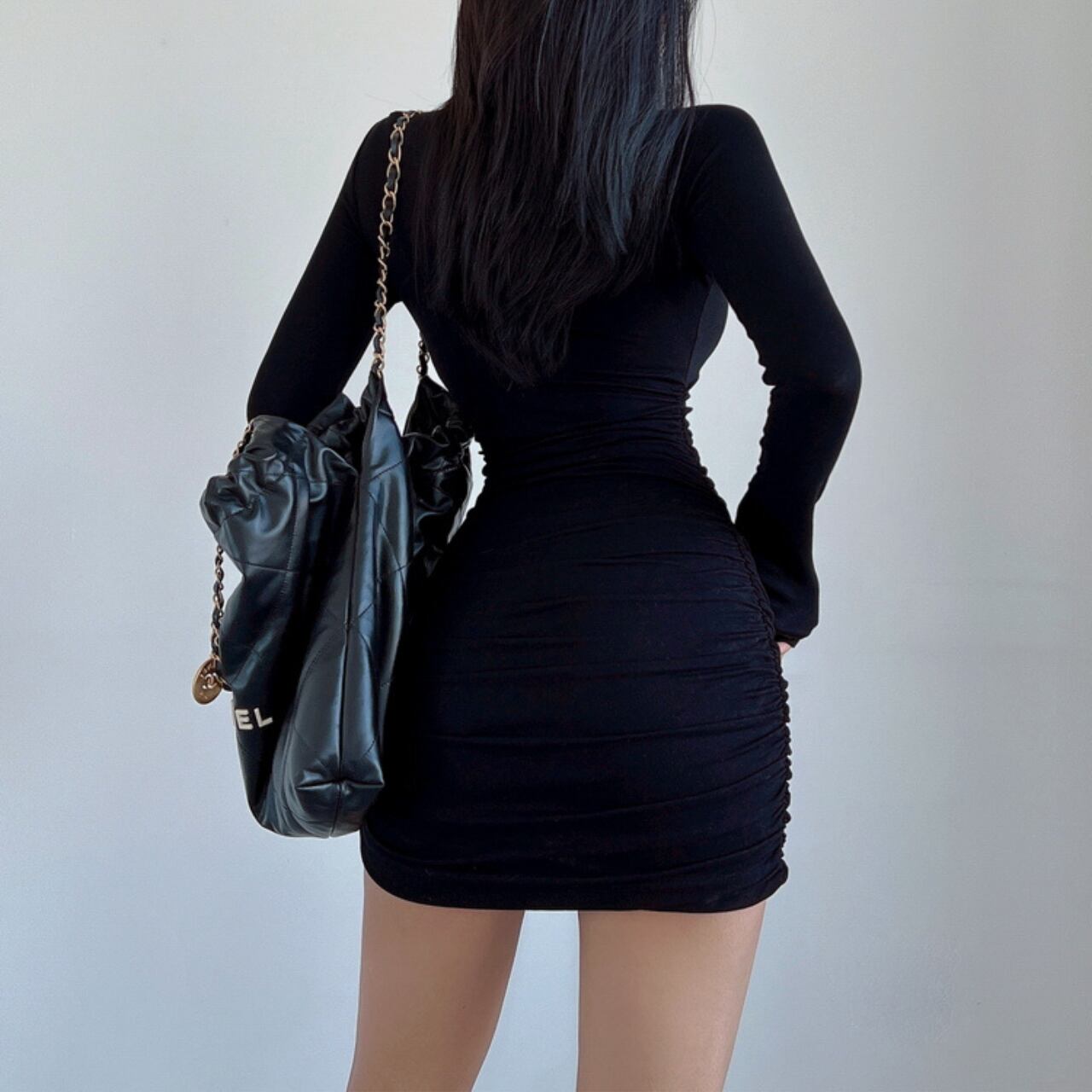 ハイネックとタイトなシルエットが、大人の女性らしさを演出するワンピース。シャーリングデザインがボディラインを美しく引き立て、スタイルアップ効果も期待できます。一枚で着るのはもちろん、ジャケットやカーディガンを羽織って、様々なスタイリングを楽しめます。
